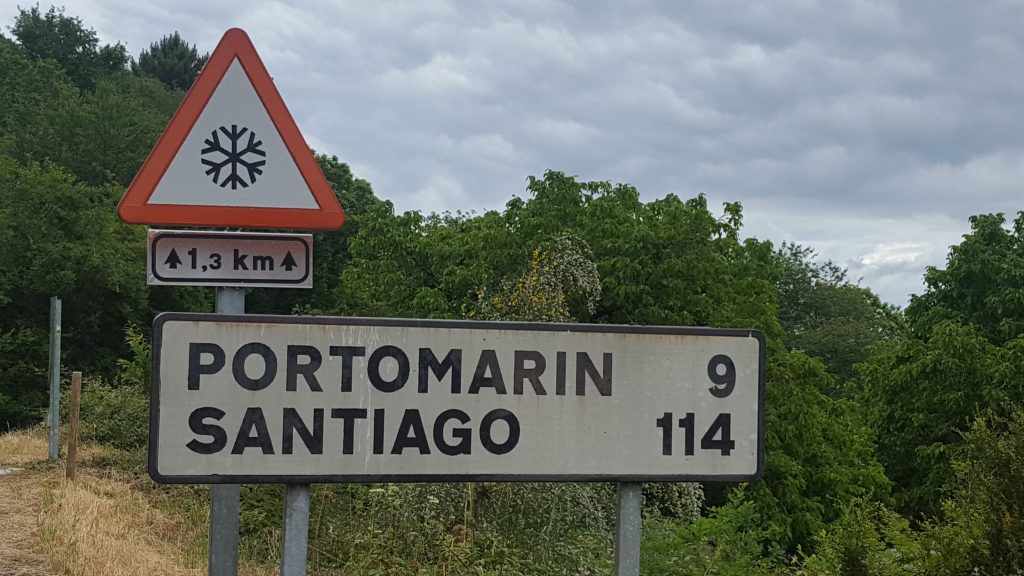 Große Zahlen heute. 70km Strecke. Auf den ersten 40km von 1500m auf 500m runter. Dabei in manchen Kehren so ein Gegenwind das wir fast treten mussten bei 7% Gefälle. Gefühlt sind wir genausoviel wieder hochgeradelt.  Und das beste, keine 100km mehr bis Santiago.