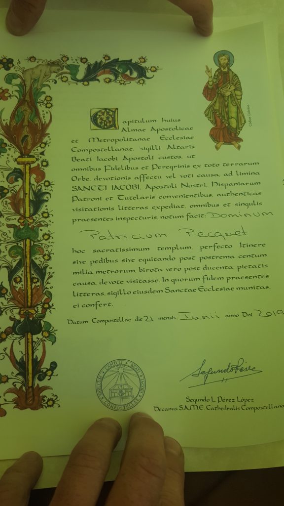 Heute morgen sind wir richtig früh aufgestanden um nicht ewig lange für die Compostella  Urkunde anzustehen. Um 8h macht das Büro auf und 8.30h hatten wir es tatsächlich geschafft dort zu stehen. Geschätzt 100 Pilger vor uns. Keine Panik. Es sind 17 Schreibtische mit Menschen die das machen. Alles ordentlich geregelt mit Ampel und Security.