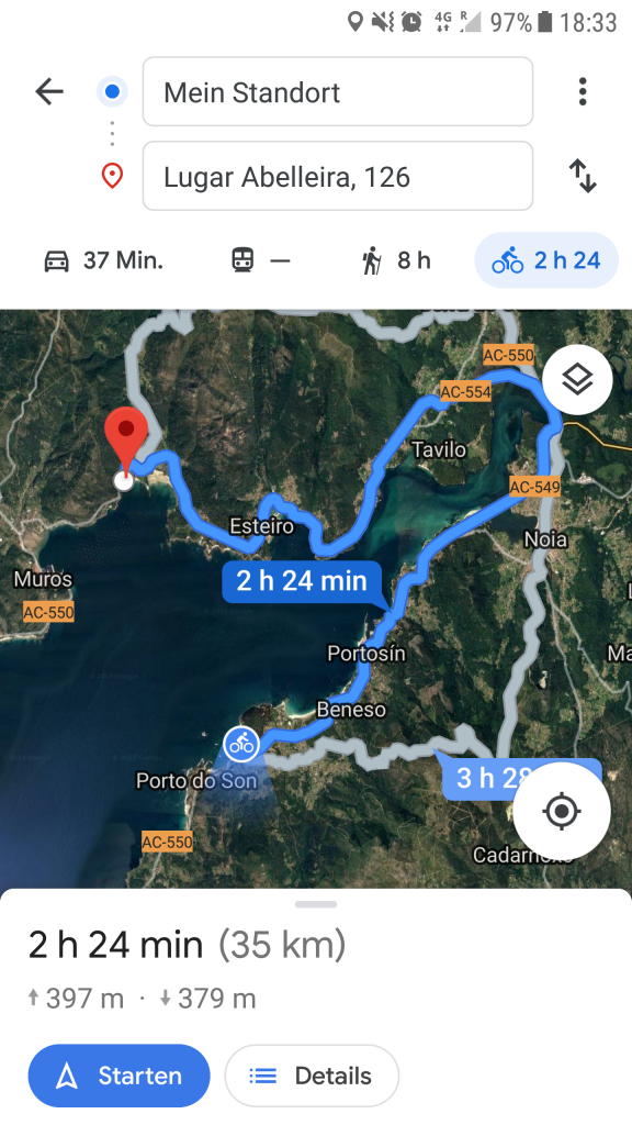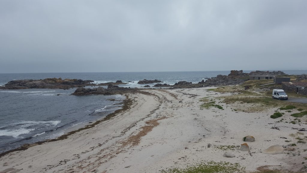 Heute sind wir gemütlich dem Küstenverlauf Richtung Süden  gefolgt.  Traumhaft. Wir wissen warum wir Meer lieben. Die Küste hier ist ein Traum. Richtig Meer halt. Wild zerklüftet und immerwieder weisse Sandstrände. So trödelten wir der Küste nach bis hinter Muros. Tankten dort nochmal dick Wasser und kurz danach sehen wir ein Wegchen zur Küste  runter.  Also Google Maps  mal aufgemacht und die Strassenlage eruiert . Hmm bescheiden!