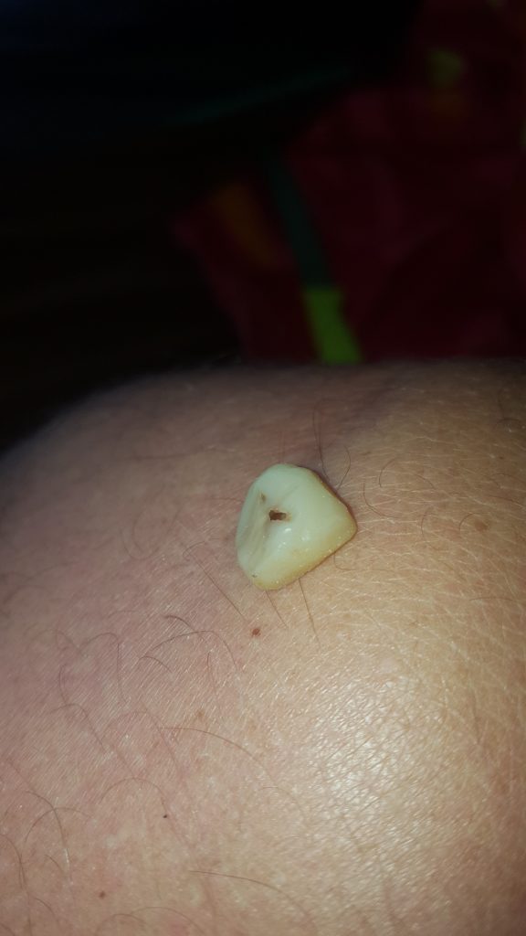 Ich löse mich auf. Meine provisorische Krone. Muss mal schauen das ich sekundenkleber kauf. Wenn man bedenkt das ausser zweimal Kettenriss und dreimal Reisekissen flicken das der einzige Schaden ist? Einfach Klasse!