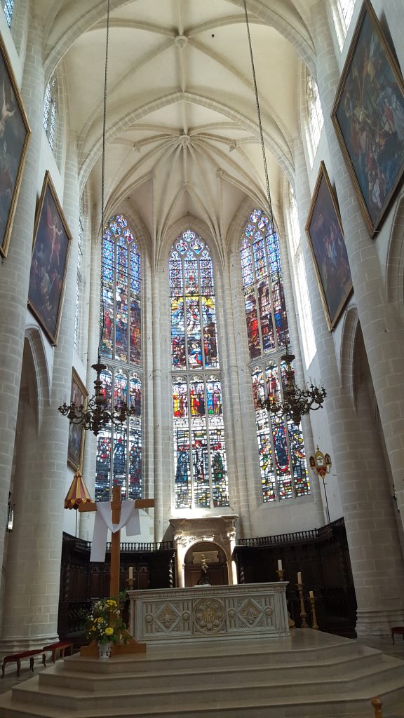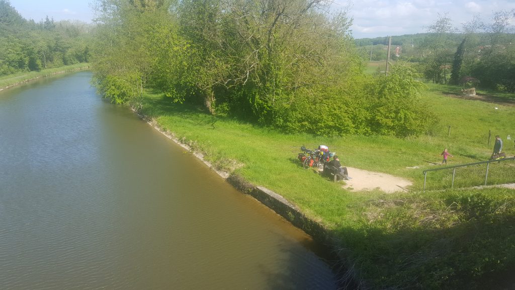 Dann Abfahrt mit dem Ziel der Kathedrale von Chalons um endlich unseren Stempel zu bekommen. Auf den Weg dorthin springt die Kette. Mist denk ich. Hab doch gerade geölt daran kanns noch liegen. Pause schauen reparieren nach nicht mal einem Kilometer. Das Mitglied hätte sich gelöst. Schlechte Mechanikerleistung der vor einem Jahr die Kette montiert hatte. Neeein Neeein. Nicht Ich! Ich hätte zum Glück das Kettenwerkzeug dabei und Gummihandschuhe. Dann weiter zur Kathedrale und kurz davor ein junger Elektroradler. Den frag ich spontan nach nem Fahrradladen. Bingo. Er schliwsst sein Rad wieder auf uns führt uns hin. Der Mechaniker meint alles gut was ich gemacht habe und wir kaufen profilaktisch ein Kettenachloss. Dann wieder Kathedrale. Die mal zu Fuss mit Fahrrad durchs Alte Zentrum. Super da Markt war. Kein böses Wort in den engen Gassen nur lächelnde Gesichter. Dann in die Kirche rein und reinschauen. Hmm wie stempeln? Hinten rechts gehts wieder raus und wir stehn im Innenhof. Aha. Ein Klingelschild. Pfarrer soundso. Der schaut nach zwei Minuten oben tu Fenster raus und bevor ich ausgesprochen habe schickt er mich zu einer anderen Kirche. Grmmmps.