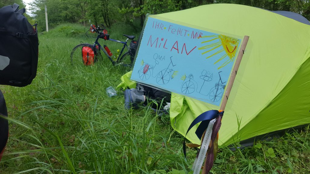 Gerade sind wir 67km gefahren mit zweimal bösen 100 Höhenmetern. Das erzähle ich gerade so meinem Zeltnachbarn und das mir so 50km am Tag geplant haben. Sagt er das wär aber schon das Minimum. Er käme heute aus Basel….grmpf.