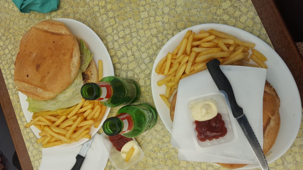 Ätsch aber ich habe meine Frau Dabei und wir haben uns gerade zwei Hack und zwei Rindersteaks mit 500gr. Bohnen reingezogen…grins