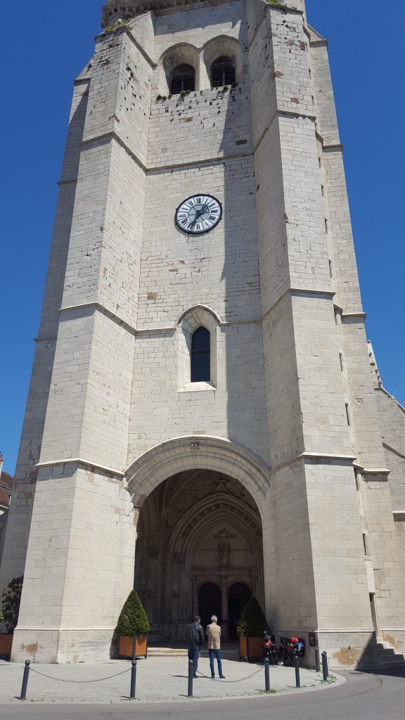 Dann Abfahrt mit dem Ziel der Kathedrale von Chalons um endlich unseren Stempel zu bekommen. Auf den Weg dorthin springt die Kette. Mist denk ich. Hab doch gerade geölt daran kanns noch liegen. Pause schauen reparieren nach nicht mal einem Kilometer. Das Mitglied hätte sich gelöst. Schlechte Mechanikerleistung der vor einem Jahr die Kette montiert hatte. Neeein Neeein. Nicht Ich! Ich hätte zum Glück das Kettenwerkzeug dabei und Gummihandschuhe. Dann weiter zur Kathedrale und kurz davor ein junger Elektroradler. Den frag ich spontan nach nem Fahrradladen. Bingo. Er schliwsst sein Rad wieder auf uns führt uns hin. Der Mechaniker meint alles gut was ich gemacht habe und wir kaufen profilaktisch ein Kettenachloss. Dann wieder Kathedrale.  Die mal zu Fuss mit Fahrrad durchs Alte Zentrum. Super da Markt war. Kein böses Wort in den engen Gassen nur lächelnde Gesichter.  Dann in die Kirche rein und reinschauen. Hmm wie stempeln? Hinten rechts  gehts wieder raus und wir stehn im Innenhof. Aha. Ein Klingelschild. Pfarrer soundso. Der schaut nach zwei Minuten oben tu Fenster raus und bevor ich ausgesprochen habe schickt er mich zu einer anderen Kirche. Grmmmps.